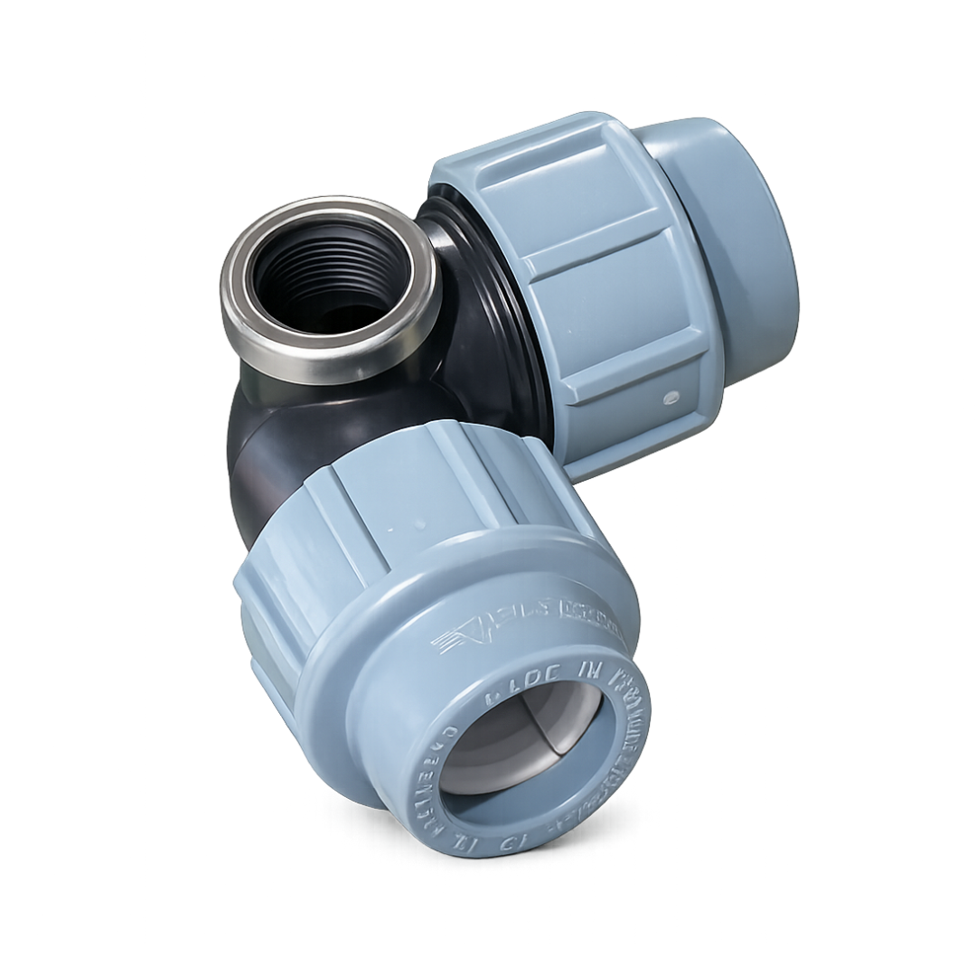 The Elbow corner or MDPE compression female threaded elbow is a 90-degree pipe fitting designed to connect MDPE pipes to male threaded components. Manufactured from high-strength polymer with a metal female threaded insert, it provides a secure directional change while maintaining a reliable threaded outlet connection. Suitable for standard MDPE compression systems, it allows integration with threaded valves, taps, or fittings during installation or maintenance.